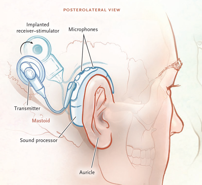 1. External processor: This part sits behind the ear and contains a microphone to detect sound and a battery to power the system. It processes sound and transmits power and signals to the internal stimulator.